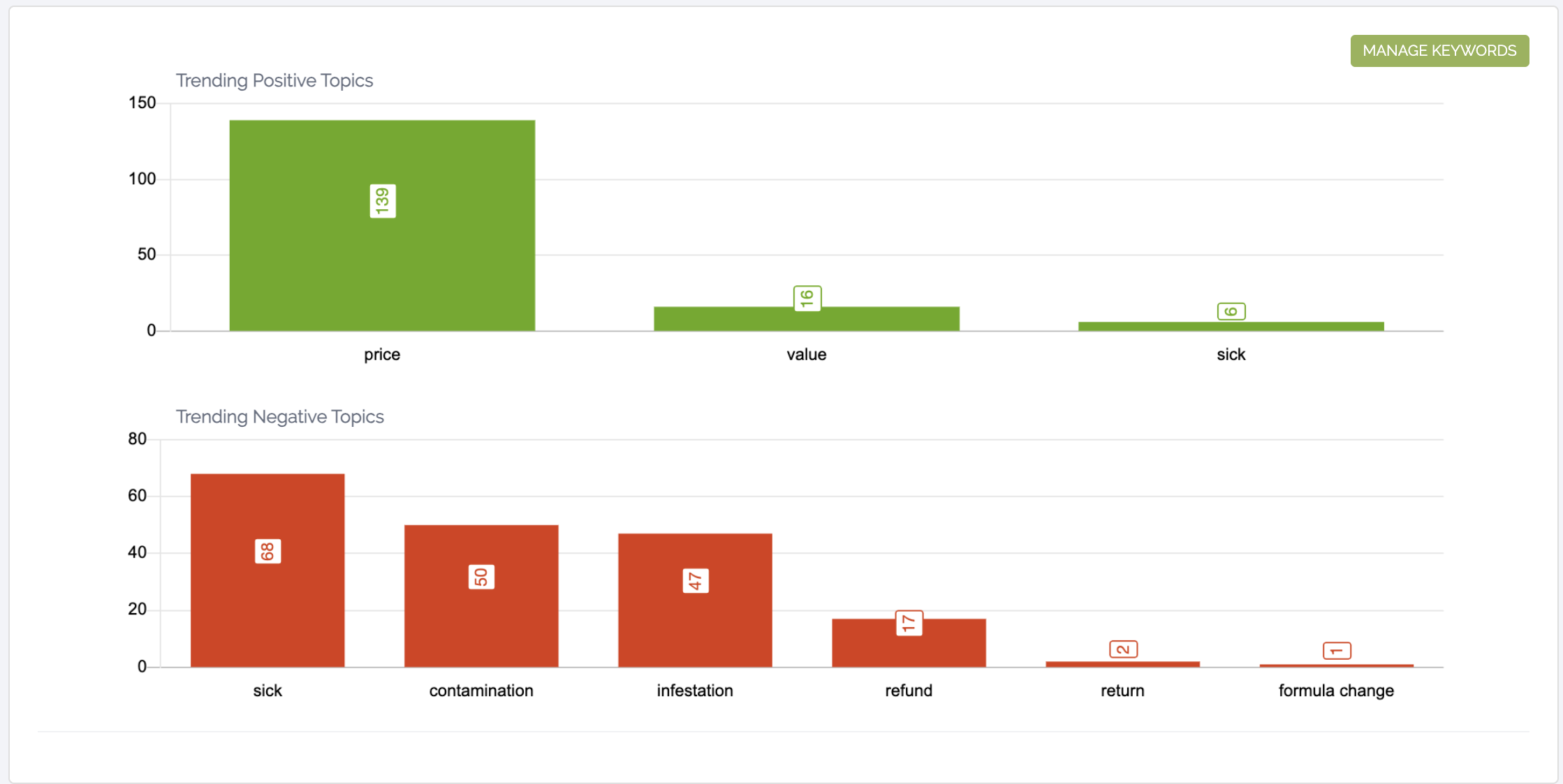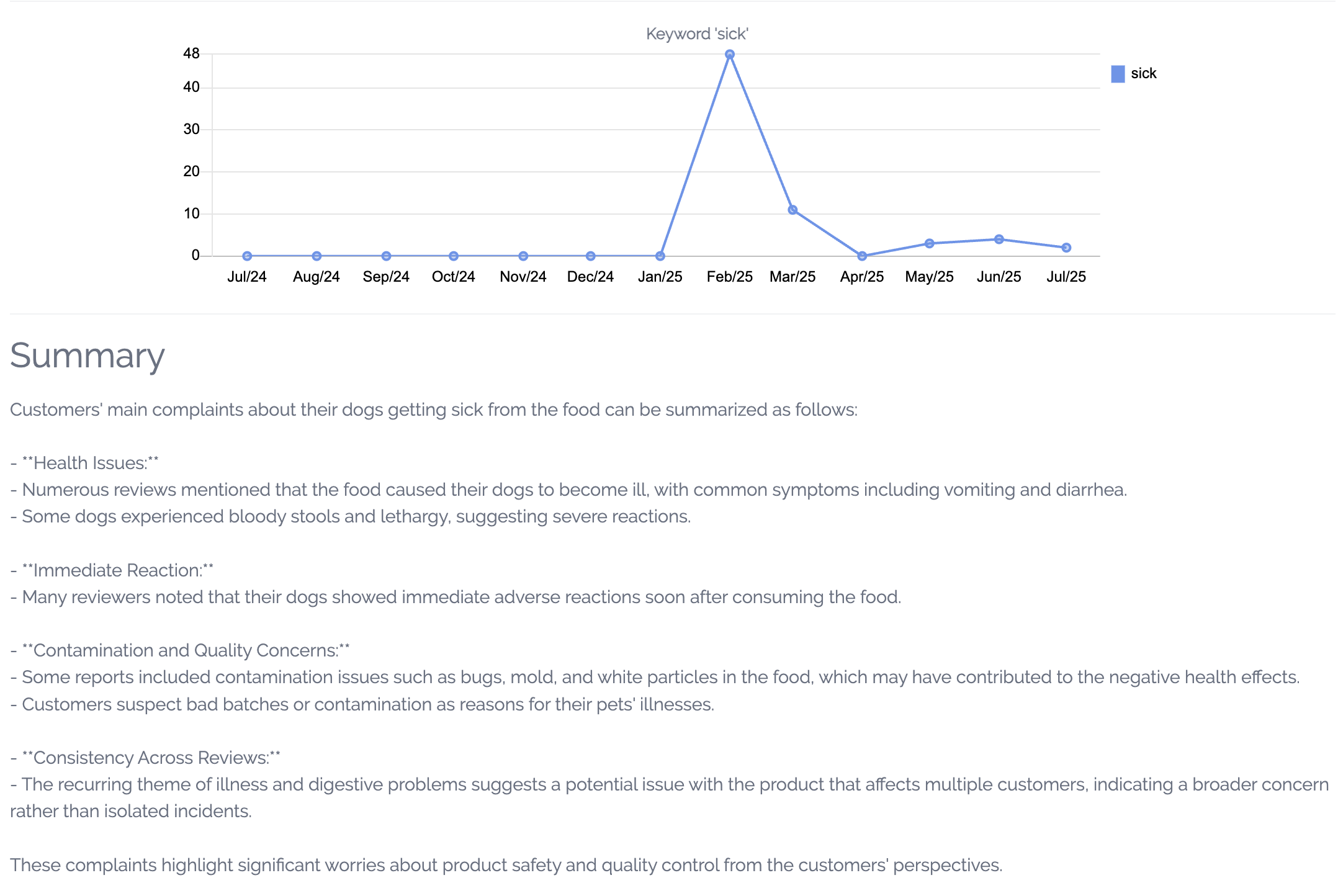 Let's follow the data and start with defense. The word "sick" is your #1 negative topic. As a QA or Brand leader, you need to know why and when this started, and you need to know now. A single click on that keyword provides an instant diagnostic report.