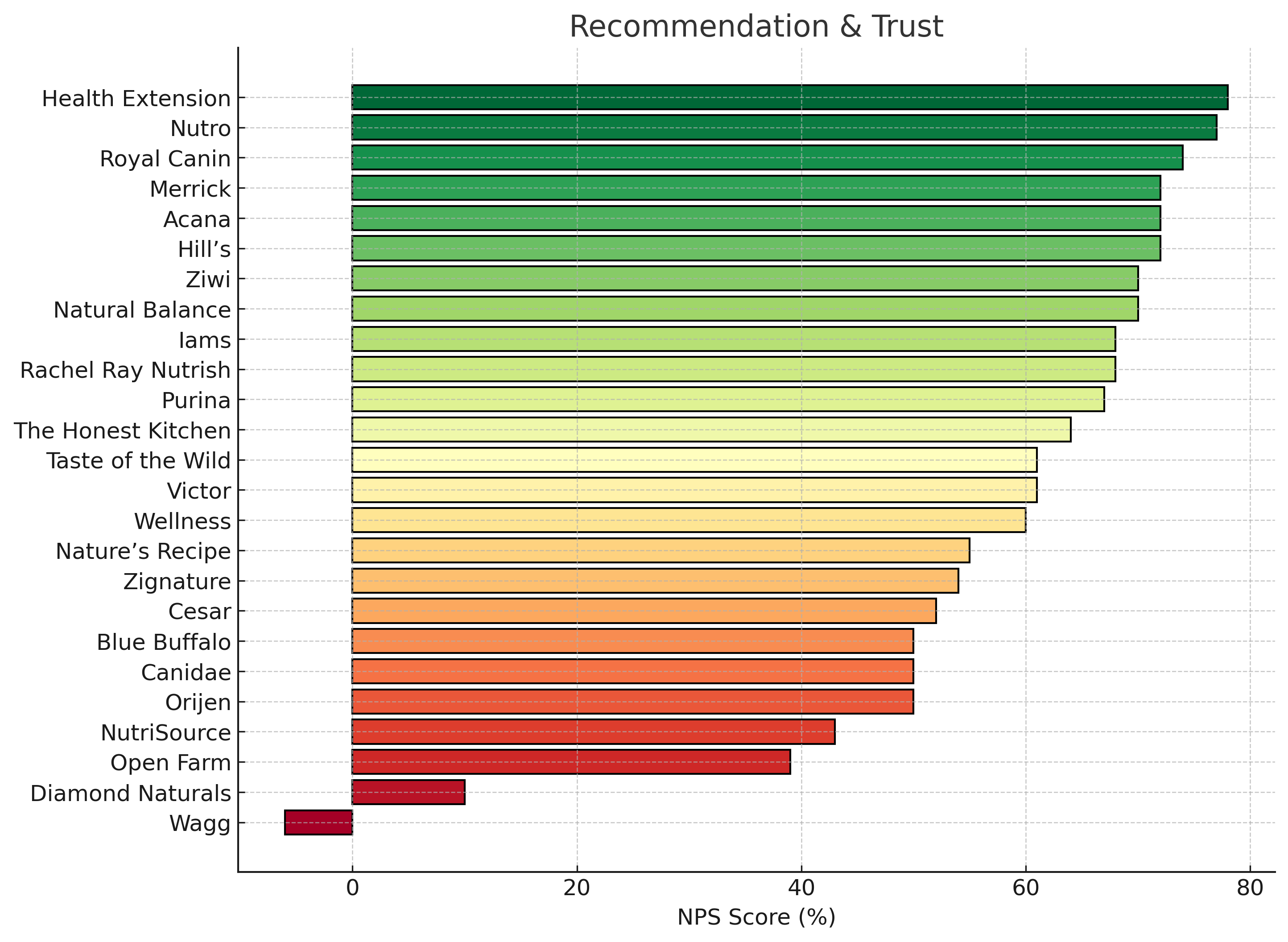 On the flip side, brands like Diamond Naturals, NutriSource, Zignature, The Honest Kitchen, Open Farm, Canidae, and Blue Buffalo face challenges in trust and recommendations. Negative experiences drive customers to competitors and damage brand reputation. Here’s what’s causing issues: