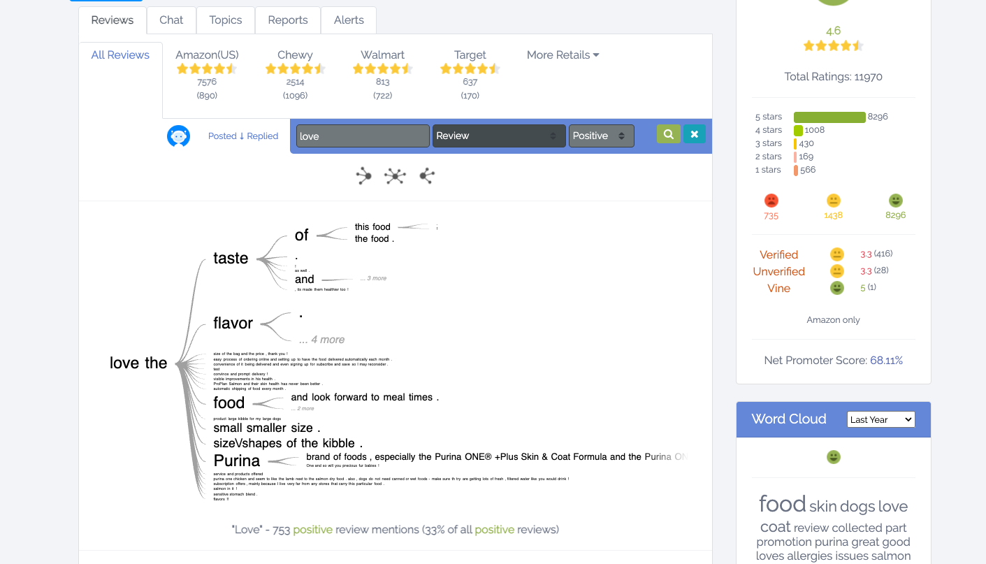 Visualize review keywords with interactive word clouds, sentiment breakdown, and NPS scores across retailers
